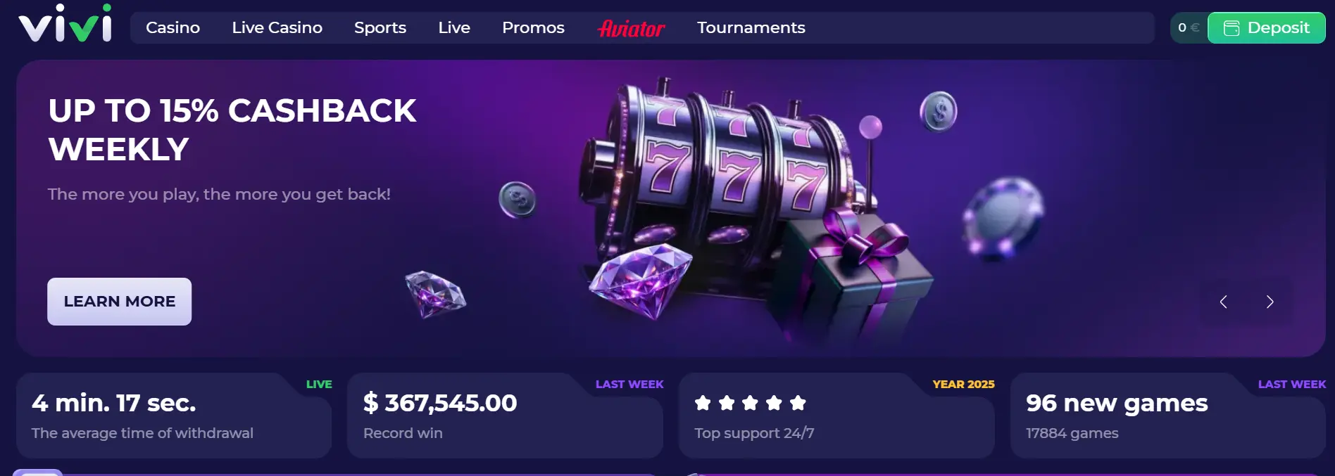- Cashback Bonus: Vivi Casino provides a weekly cashback bonus, granting players 10% of their net losses back, which softens the blow of a bad losing streak. This ensures that you can benefit from cashback in a worry-free manner. This bonus is ideal for players who might be suffering from a rough week, and could use some extra help getting back on the action.